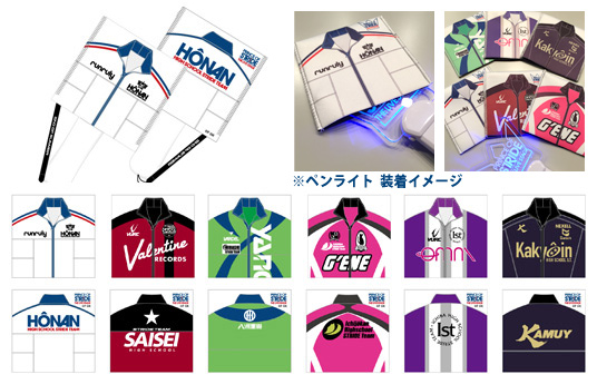 青(方南)・赤(西星)・緑(三橋)・ピンク(一条館)・紫(市場)・黄色(花京院)の6色に点灯するペンライトです!